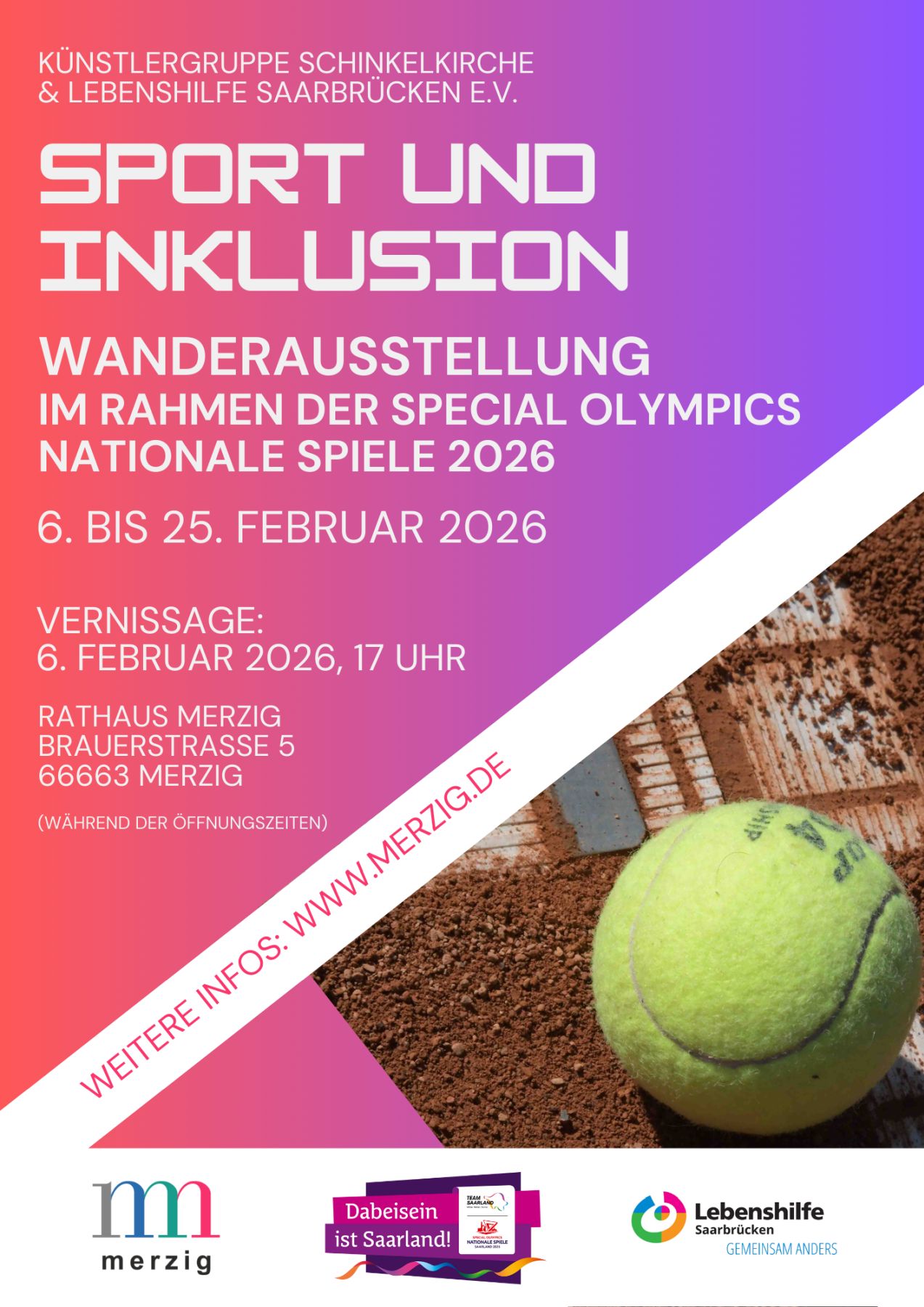 Im Hinblick auf die Special Olympics Nationalen Spiele präsentiert die Kreisstadt Merzig vom 06.02.2026 bis zum 25.02.2026 erstmalig im Saarland die inklusive Wanderausstellung der Künstlergruppe Schinkelkirche aus Bischmisheim zusammen mit der Lebenshilfe Saarbrücken im Neuen Rathaus. Die Wanderausstellung trägt den Titel „Sport und Inklusion“.