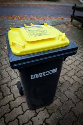 | Gelbe Tonne Die Gelbe Tonne hat einen Deckel. In die Gelbe Tonne kommen Verpackungen. Zum Beispiel aus Kunst-Stoff. Verpackungen kann man nochmal verwenden. Dazu sagt man auch: recyclen. Das spricht man so aus: re-zei-keln In die Gelbe Tonne kommt zum Beispiel auch: