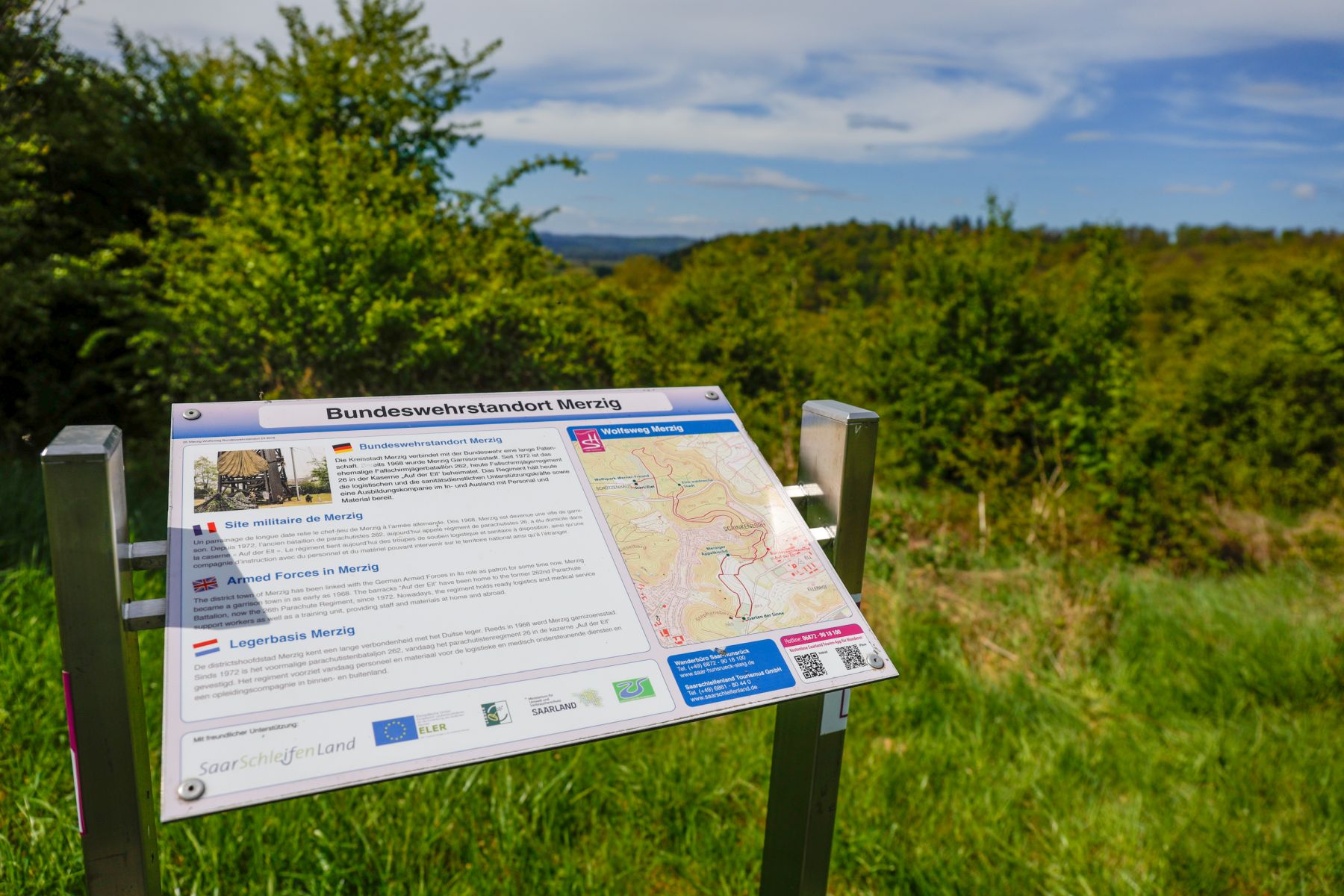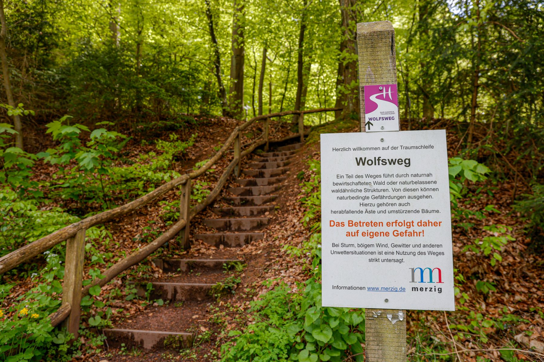 Der Weg verbindet zwei attraktive Merziger Sehenswürdigkeiten: den weitbekannten „Wolfspark-Werner Freund“ im Kammerforst und den „Garten der Sinne“ auf dem Kreuzberg.